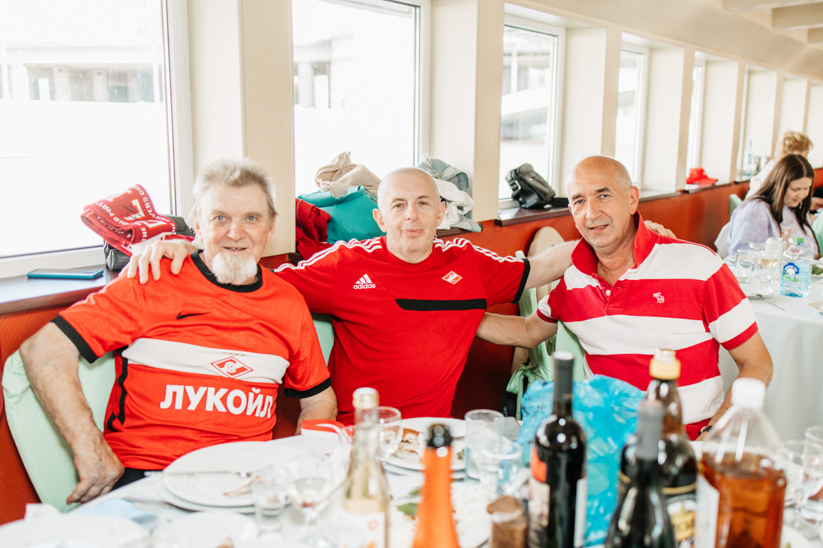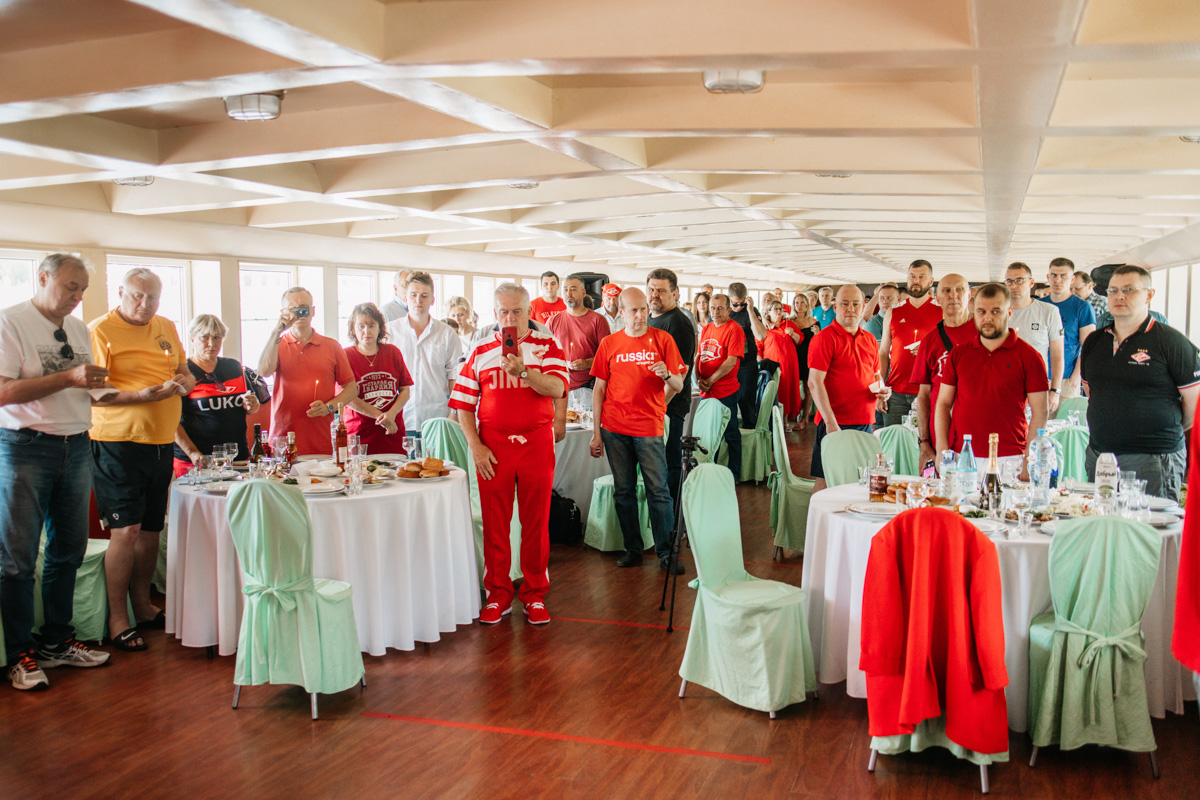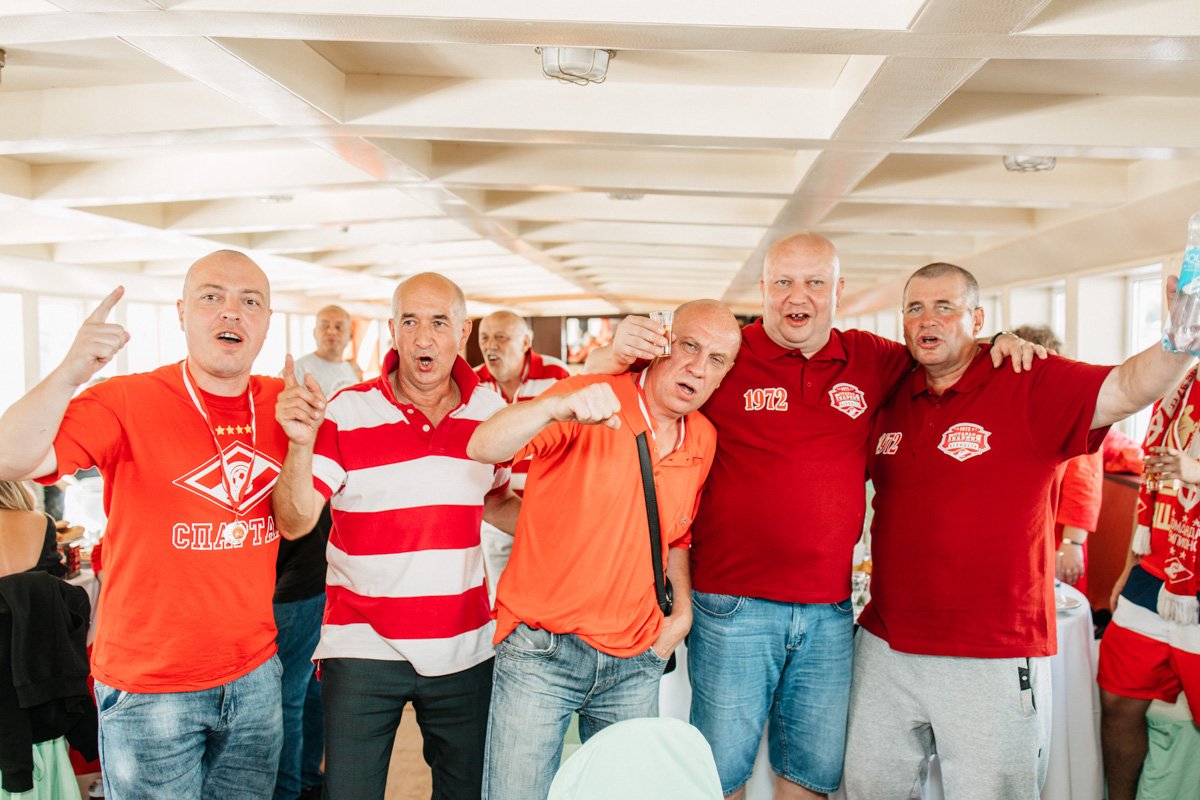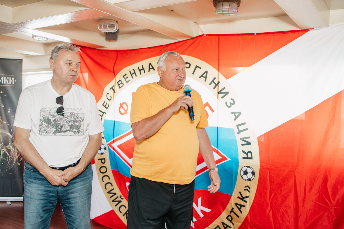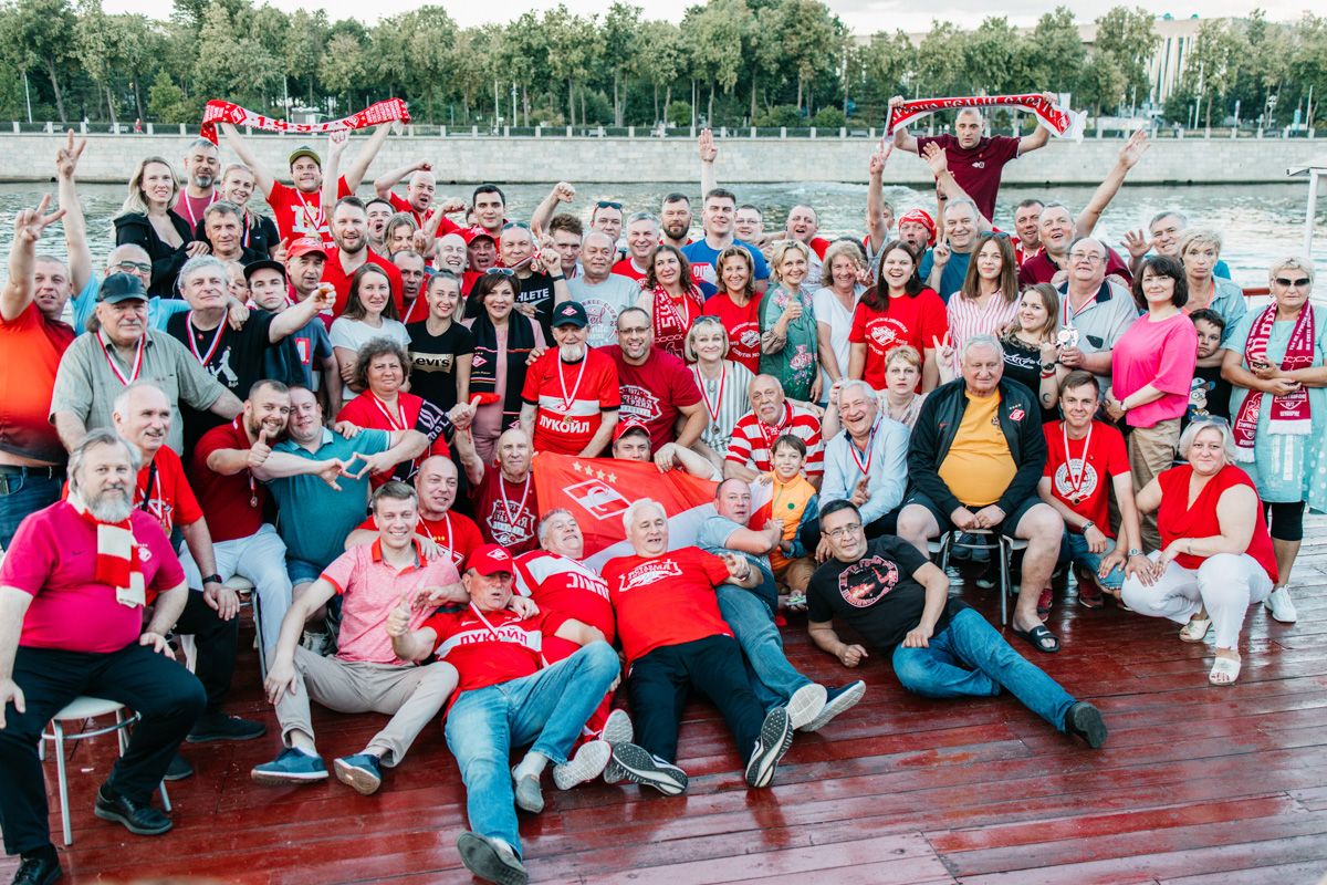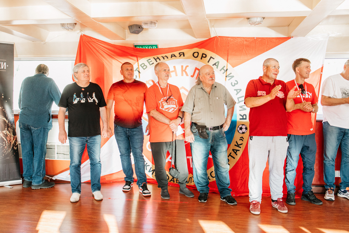 Ветеран "Спартака" Юрий Гаврилов и Владимир Гришин провели награждение от имени Российского физкультурно-спортивного общества "СПАРТАК". По окончании первого блока награждения наши музыканты Евгений Балашов и Юрий Гришин исполнили насколько популярных песен, в том числе спартаковских. Во втором блоке награждения многих болельщиков, в основном, молодых наградили жетонами 3-й степени "50 лет фанатского движения". Награждение проводил ветеран московского "Спартака" Сергей Швецов. Жетонами первой степени награждались в основном ветераны движения - члены Старой Гвардии болельщиков "Спартака". Награждение проводили ветераны "Спартака" Юрий Гаврилов и Сергей Швецов. После награждения и застолья все участники круиза поднялись на верхнею палубу теплохода, чтобы сфотографироваться на фоне Большой спортивной арены "Лужники", где московский "Спартак" играл многие годы. И где ветераны движения стали настоящими фанатами команды. После фотографирования "красно-белый хор" начал исполнять фанатские песни. С берега и встречных теплоходов люди махали руками и даже пытались поддержать болельщиков. С одного из встречных теплоходов в ответ зарядили "Московский "Спартак"! Юрий Гаврилов и Сергей Швецов приняли участие в награждении ветеранов спартаковского движения членов Старой Гвардии болельщиков. По окончании награждения праздник переместился на танцпол, где прошла красно-белая дискотека. Наш теплоход уже пришвартовался к причалу "Кленовый бульвар", а расходиться никто не хотел. Тем не менее все хорошее рано или поздно заканчивается. Вот и наш чудесный вечер подошел к концу. И самая большая награда для организаторов, что все участники праздника остались в полном восторге! Мы благодарим всех участников нашего с вами праздника, ветеранов "Спартака" Сергея Швецова и Юрия Гаврилова, музыкантов Евгения Балашова и Юрия Гришина, организаторов вечера. Также выражаем огромную благодарность генеральному партнёру мероприятия - компании "Хамовники" за предоставление пенных напитков, РФСО "СПАРТАК" и интернет-магазину "Спартак Маркет" за поддержку праздника.