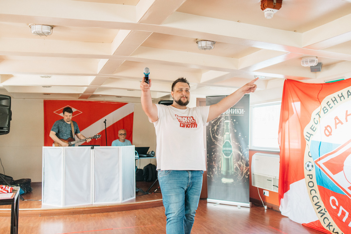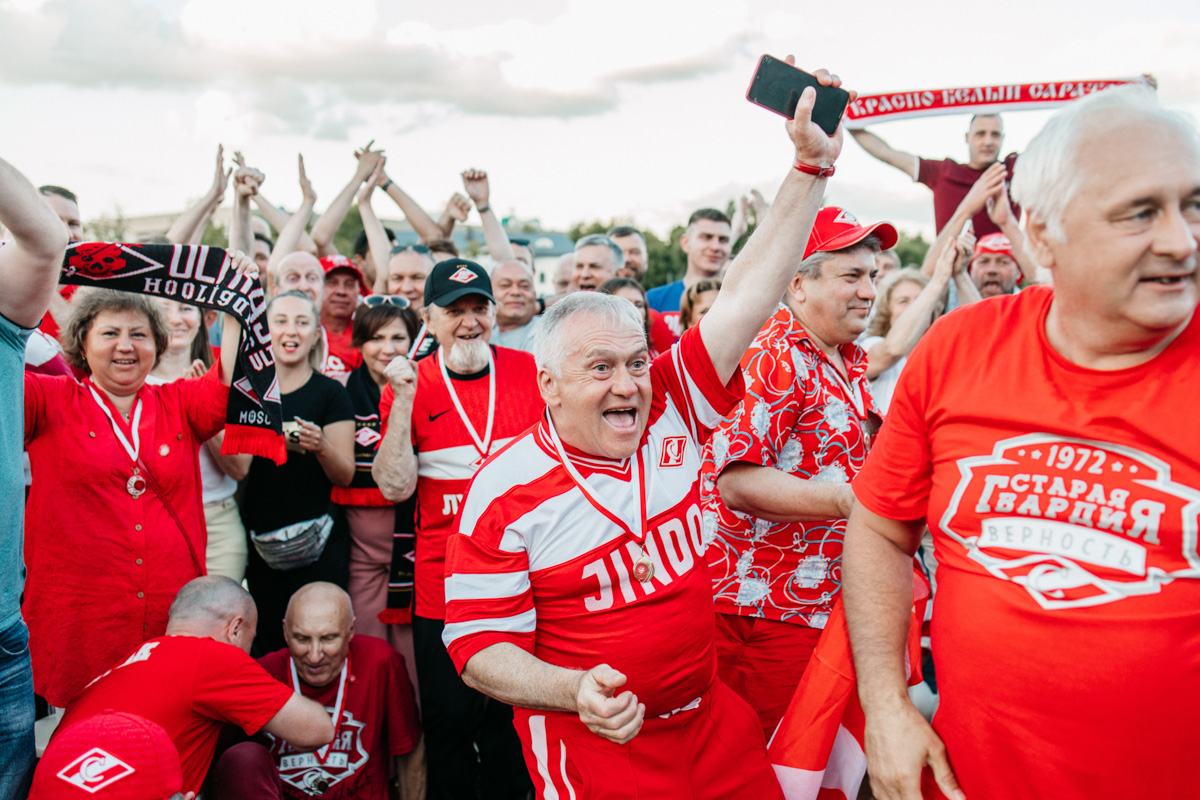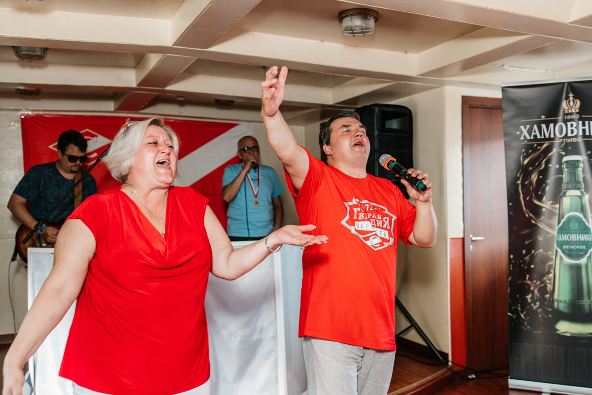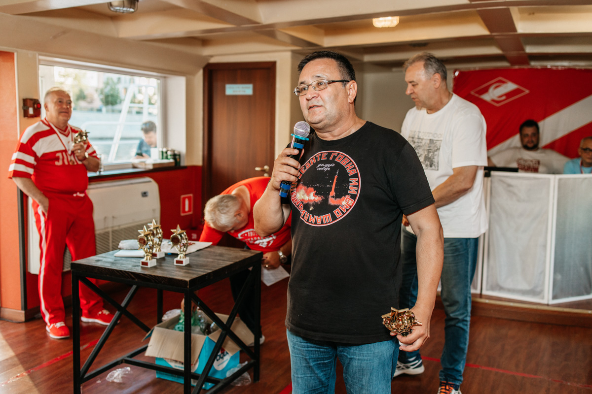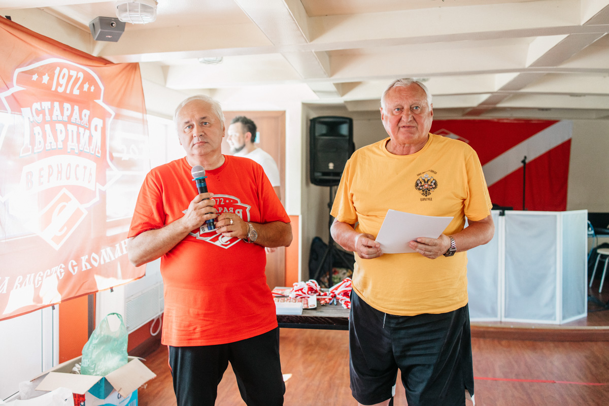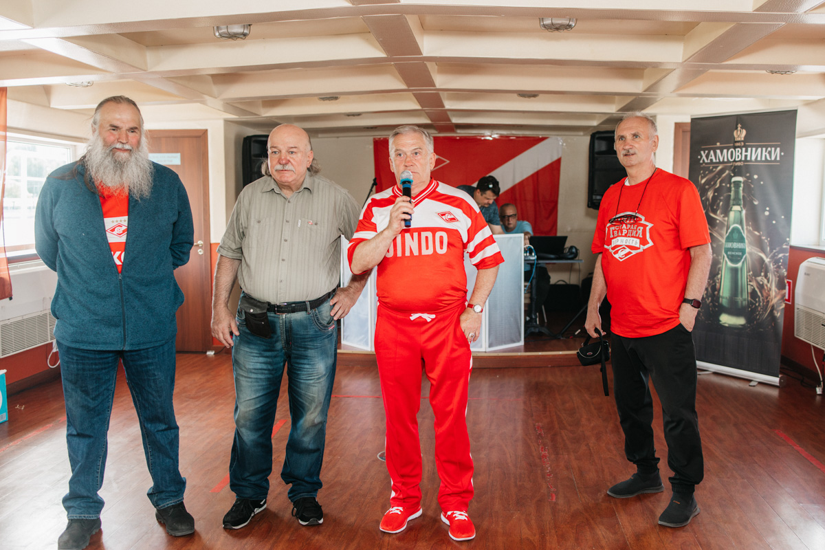 Ветеран "Спартака" Юрий Гаврилов и Владимир Гришин провели награждение от имени Российского физкультурно-спортивного общества "СПАРТАК". По окончании первого блока награждения наши музыканты Евгений Балашов и Юрий Гришин исполнили насколько популярных песен, в том числе спартаковских. Во втором блоке награждения многих болельщиков, в основном, молодых наградили жетонами 3-й степени "50 лет фанатского движения". Награждение проводил ветеран московского "Спартака" Сергей Швецов. Жетонами первой степени награждались в основном ветераны движения - члены Старой Гвардии болельщиков "Спартака". Награждение проводили ветераны "Спартака" Юрий Гаврилов и Сергей Швецов. После награждения и застолья все участники круиза поднялись на верхнею палубу теплохода, чтобы сфотографироваться на фоне Большой спортивной арены "Лужники", где московский "Спартак" играл многие годы. И где ветераны движения стали настоящими фанатами команды. После фотографирования "красно-белый хор" начал исполнять фанатские песни. С берега и встречных теплоходов люди махали руками и даже пытались поддержать болельщиков. С одного из встречных теплоходов в ответ зарядили "Московский "Спартак"! Юрий Гаврилов и Сергей Швецов приняли участие в награждении ветеранов спартаковского движения членов Старой Гвардии болельщиков. По окончании награждения праздник переместился на танцпол, где прошла красно-белая дискотека. Наш теплоход уже пришвартовался к причалу "Кленовый бульвар", а расходиться никто не хотел. Тем не менее все хорошее рано или поздно заканчивается. Вот и наш чудесный вечер подошел к концу. И самая большая награда для организаторов, что все участники праздника остались в полном восторге! Мы благодарим всех участников нашего с вами праздника, ветеранов "Спартака" Сергея Швецова и Юрия Гаврилова, музыкантов Евгения Балашова и Юрия Гришина, организаторов вечера. Также выражаем огромную благодарность генеральному партнёру мероприятия - компании "Хамовники" за предоставление пенных напитков, РФСО "СПАРТАК" и интернет-магазину "Спартак Маркет" за поддержку праздника.