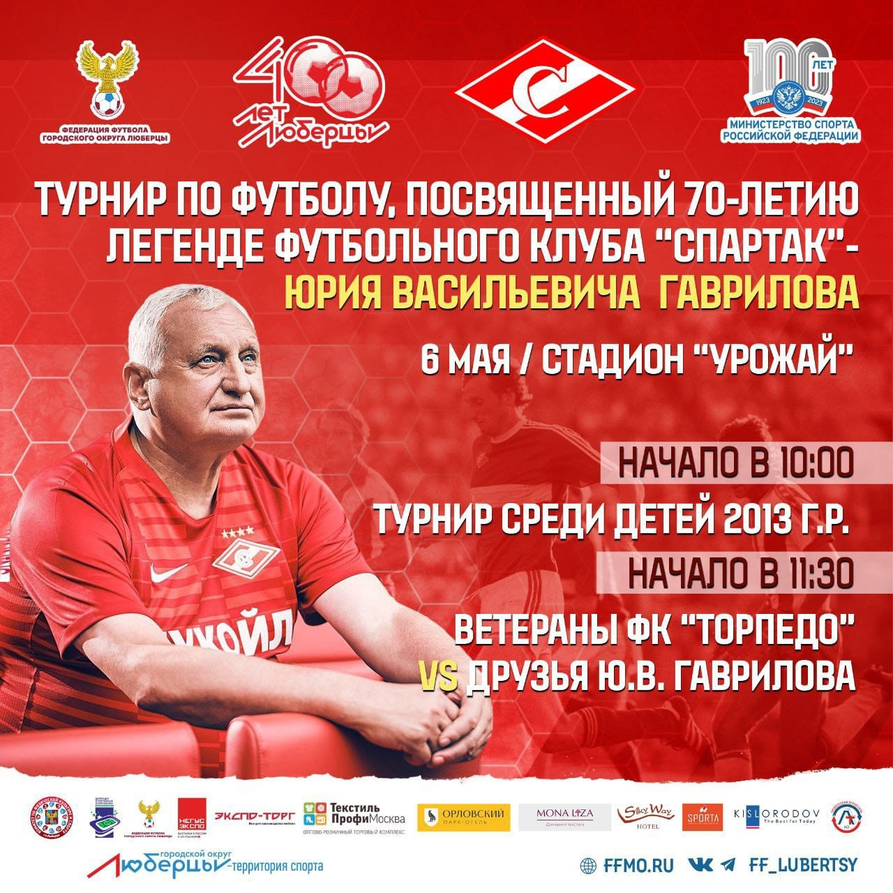 6 мая на стадионе "Урожай" в Томилино (ГО Люберцы) пройдет матч ветеранов Люберецкого "Торпедо" и друзей Юрия Васильевича Гаврилова. Игра посвящена 70-ти летнему юбилею Юрия Васильевича.