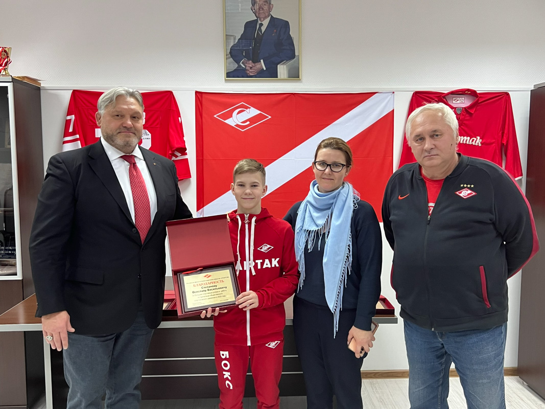 Награждение началось с вручения Всеславу Степанову подарочной плакетки, как победителю конкурса. Председатель РФСО "СПАРТАК" Андрей Слушаев сказал теплые и напутственные слова юному спортсмену: "Мы уверены, что Всеслав - красивое боксерское будущее "Спартака". А сегодня он - "Спартаковец года"!"