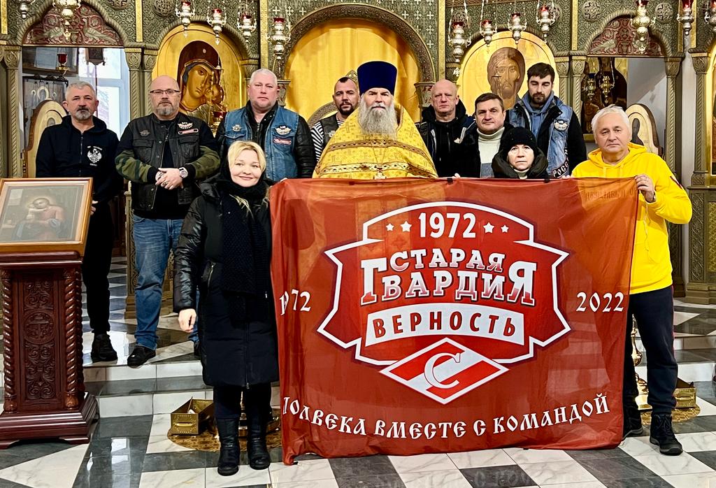 Затем Отец Алексий провел торжественный молебен о благополучии и здоровье наших воинов и всех кто стоит на защите своего Отечества, о людях бескорыстно помогающих нашим бойцам не передовой. А закончил Отец Алексий молебен словами обращенными ко всем спартаковским болельщикам с пожеланием здоровья, добра и благополучия!